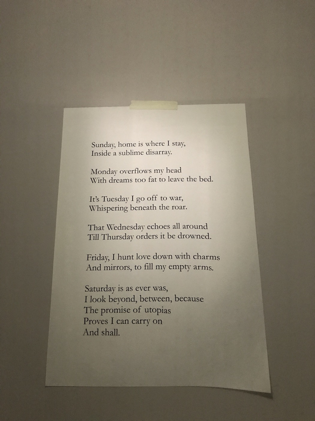 Chaque partie de l’exposition correspond à un jour précis de la semaine, où chacun pourra, comme le souhaite cette exposition, donner un sens au modèle de la vie quotidienne.