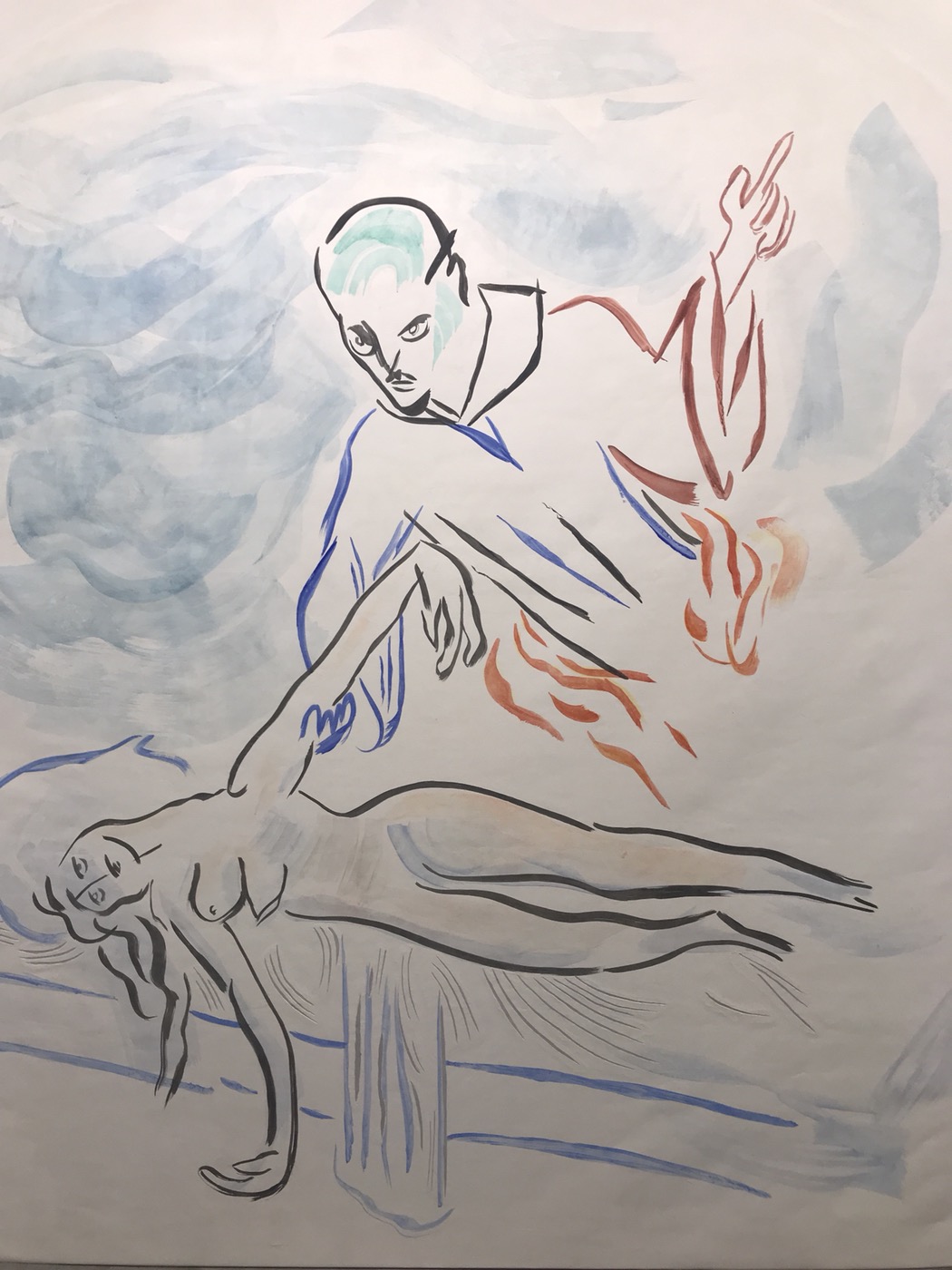 L’exposition s’achève par des vers graffités sur les rampes d’escaliers qui mènent à la sortie, œuvre du poète Jacob Bromberg.