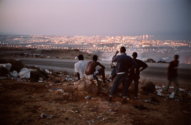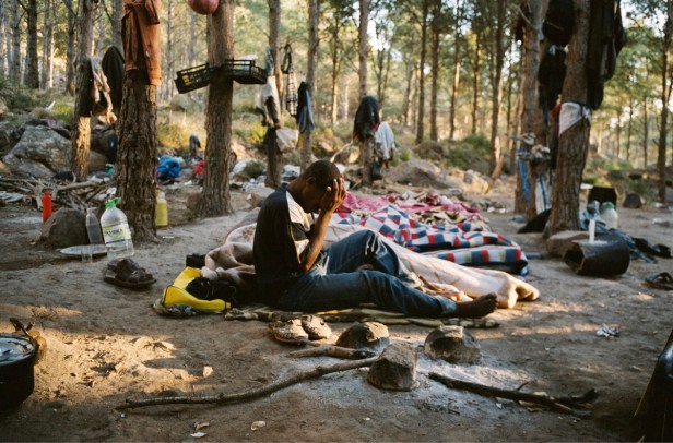 « De la décharge d’ordure située près du Camps, on peut voir l’Espagne. Les camarades viennent la et ils rêvent. L’une des façons de se retrouver en Europe est de franchir les barrières de 4m de haut dont on peut voir les lumières. Mais les passeurs prennent chers. »