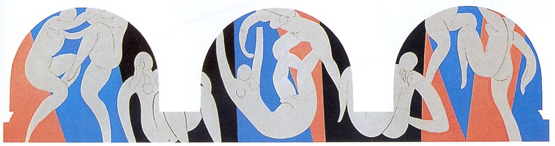 Après plusieurs études exécutée à partir de 1930, Matisse, alors âgé de 60 ans, commencé en avril 1931 à mettre au point la composition sur 3 toiles : 8 figures sont tracées à l’aide d’un fusain fixé à l’extrémité d’un bambou, puis peinte à l’huile dans une couleur de grise sous fond bleu.Cette danse inachevée reprend le thème de la ronde du Bonheur de vivre de 1905 -1906. Par ses effets de touche, sa profondeur, son rendu très pictural, il s’agit d’un tableau au sens traditionnel. En 1931, Matisse renonce à poursuivre cette version des multiples remaniements que demande la finalisation à l’huile d’une peinture d’un format «surhumain». Utilisant La Danse Inachevée comme support pour épingler ( trous d’épingles encore visibles) des papiers colorés et découpés, il commence La Danse dite de Paris. Cette méthode qui lui sert à trouver sa composition révolutionne la peinture murale. La Danse Inachevée est abandonnée et roulée. Elle sera redécouverte au printemps 1992 à paris.La danse de paris, 1933