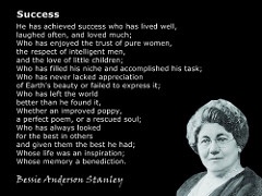 Mais il est à tort attribué à Emerson, si je peux me permettre cette petite correction. Il a été écrit par Bessie Anderson Stanley. C’était pour un concours organisé par un magazine américain en 1904 dont le thème était « définir le succès en moins de 100 mots. » Bessie A. Stanley avait alors une vingtaine d’années et a remporté le premier prix.