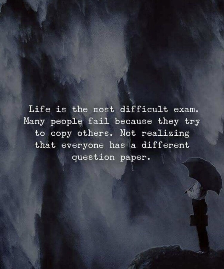 « la vie est l’examen le plus difficile. Beaucoup de gens échouent parce qu’ils essaient de copier d’autres. Ne réalisant pas que tout le monde a un papier de questions différentes.»