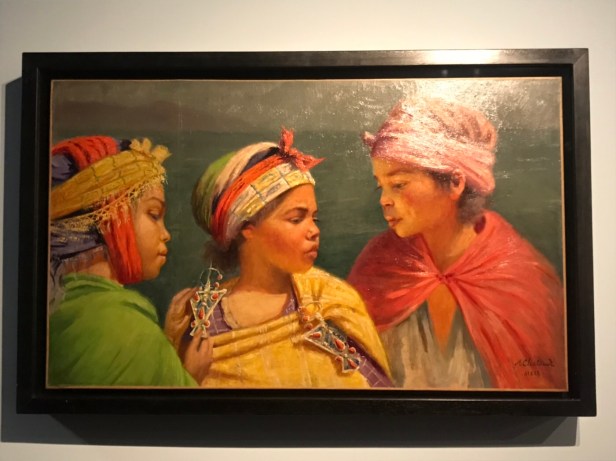 Les trois jeunes filles algériennes dont il fait ici le portrait portent des étoffes aux couleurs vives et enrichissent leurs tenues de fibules en corail et émaux.