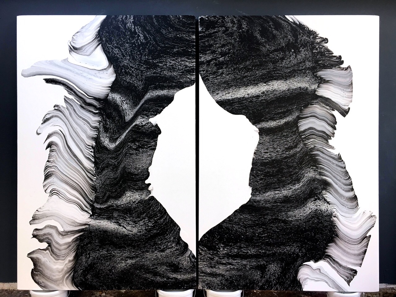 Si le tempo n’est pas nécessairement visible dans l’espace intemporel de ses toiles, les formes engendrées par ses mouvements sont les manifestations fossiles d’une mécanique des fluides qui varie en fonction du rythme qu’on lui impose. Son travail n’existe que dans l’instant, tout en s’installant, immuable ou changeante, dans une durée proche de l’éternel. Ses œuvres laissent place à la méditation contemplative, chacun se retrouvant confronté pour un instant au vide des temps astronomiques et à l’immobilité apparente d’un paysage en perpétuel changement.