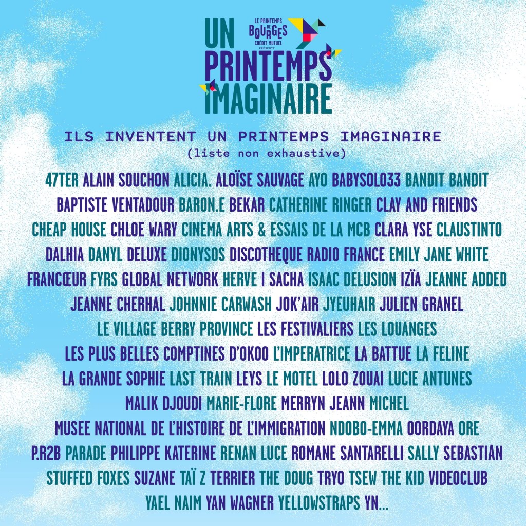 Pour faire face à cette annulation, un Printemps Imaginaire a été mis en place sous forme de festival en ligne par les organisateurs. La programmation de cette dernière a été dévoilé la semaine dernière par les équipes du festival. Au menu des Live exclus, des créations spécialement conçus pour l’occasion. A ne pas manquer, les prestations de nos coups de cœur : Bandit Bandit, Clay and friends, Hervé, Jeanne Added, Marie-Flore, PR2B, Vidéoclub, RENAN Luce, Ayo, Baptiste Ventadour,Alain Souchon, Catherine Ringer ou encore Philippe Katerine.