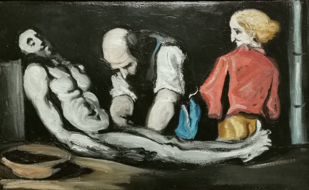 Cette originalité est encore plus frappante lorsqu’il se rapproche de ses modèles. « La déposition du Christ » de Ribera devient « la toilette funéraire ou l’autopsie ». La peinture ancienne était religieuse, qu’il s’agisse de sujet chrétien, ou de mythologie classique. Cézanne a été chrétien, mais sa peinture est laïque, façon Troisième République. Elle ne représente pas l’au-delà, mais l’ici et maintenant. Que ce soit dans ses scènes de genre meurtrières ou dans ses paysages, Cézanne annonce un monde sans transcendance, où Dieu est absent. Mais faisant cela il annonce un temps où le tableau n’est plus de toile, pigments, brosses et pinceaux. Pour aller vers l’abstraction, celle d’une Soulage ou d’un Pollock, il fallait sans doute passer par le dépouillement physique et intellectuel de Cézanne.