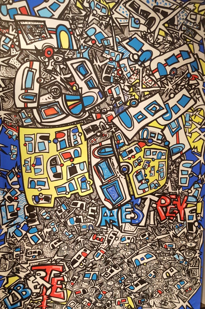 Après un long arrêt il a enfin repris la route avec ses toiles et ses guitares. Il mène son exposition Ida y Vuelta (aller et retour). Gabi fait parti des « gens du voyage ». Toute son œuvre est dédiée à monter leur vie, les guitares, les taureaux, les caravanes, les chemins, les persécutions dont ils ont fait l’objet (et malheureusement qui les poursuivent encore). Des chambres à gaz à la rumba catalane, il multiplie les techniques. Il manie l’humour avec brio. Mais il sait aussi faire preuve de patience et d’empathie pour faire découvrir son art aux enfants et les aider à se réaliser.