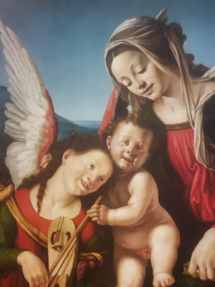 Et à la fin de la visite revenez voir la Vierge à l’enfant aux deux anges de Piero di Cosimo. Nous vivons des temps de morosité, où tout le monde parle de contagion, de confinement, de réchauffement climatique et de perte de la biodiversité. Il est bon parfois de reprendre une bouffée d’optimisme. L’époque de Piero di Cosimo n’était pas spécialement gaie. Il y avait les guerres d’Italie, la peste installée de façon endémique, le petit âge glaciaire qui refroidissait l’atmosphère et provoquait des famines. Mais le peintre a fait cette œuvre pleine de gaieté pour nous réchauffer le cœur.
