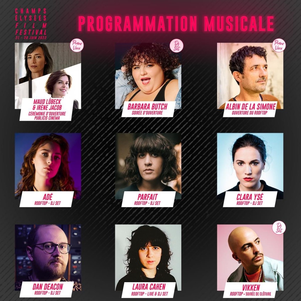 Clara Ysé, Vikken, Laura Cahen, Barbara Butch mais également Adé, Parfait, apporteront leur contribution artistique, leur dynamisme et originalité à ce Champs-Elysées Film Festival, promettant aux participants des soirées privilégiées & émotionnellement intenses, fidèles à l’esprit de ce festival, où rigueur, talents, esprits libres se côtoieront comme dans un bon scénario haletant & bien ficelé.