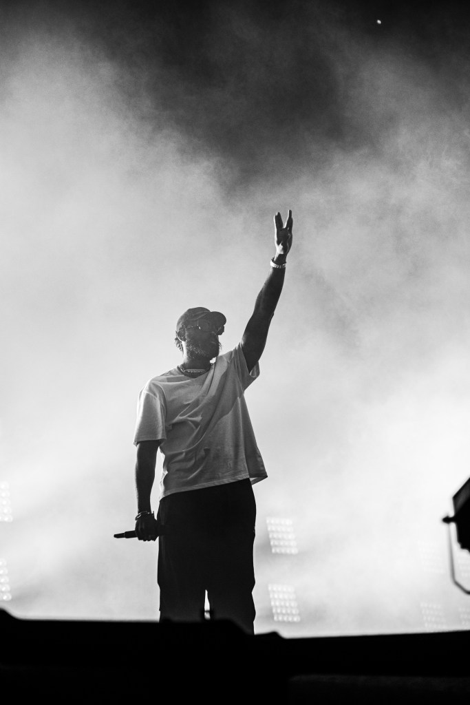 La mise en scène est impressionnante : l’univers de l’artiste se fait ressentir dès la première seconde. Des visuels 3D en noir & blanc, des effets d’anciennes VR sur les écrans. Chaque musique à son propre univers sur cette scène. Puis les flammes, toujours plus agressives, prennent possession de la scène. Il chante quelques musiques de son dernier album QALF, mais la majorité du concert se tourne vers d’anciens titres (Macarena, J Repect R, Périscope et bien d’autres). Il revient également sur beaucoup de ses feats. (Disiz, Angèle, Aya Nakamura, Hamza). Si aucun de ces artistes n’est présent physiquement, ils sont présentés sur les écrans géants et font parties intégrantes du show. Et pour terminer, « Mwaka moon », un titre déjà devenu un classique du rap français, chanté en cœur par une foule conquise par l’ambiance festive qui n’a cessé d’aller crescendo jusqu’aux derniers instants.