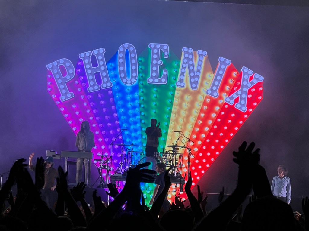 Et quand on croit que c’est fini, bah il y en a encore. C’est l’instant Thomas Mars. Ce petit plaisir qu’il s’offre à la fin de chaque concert, lorsque la foule le porte tel un seul homme au milieu de la fosse et qu’il roule sur leurs mains jusqu’à atteindre la scène, où le reste du groupe l’accueil au rythme de leurs instruments tonitruants. Standing ovation nourrie de la foule qui accompagne la sortie du groupe pendant que son nom s’inscrit en grand sur l’écran et aux couleurs de l’arc-en-ciel.