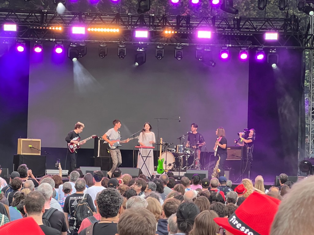 Une heure plus tôt, au hasard d’une flânerie dans le parc, ce sont les mélodies accrocheuses du quintet En Attendant Ana, qui nous attira devant cette même scène du Bosquet. Deux filles et trois garçons en harmonie avec leurs instruments pour nous offrir un savant mélange de pop française et de rock anglo-saxon. Malheureusement pour nous, on arrive à la fin de la prestation de la bande emmenée par Margaux Bouchaudron, mais on s’empressera d’écouter leur 3e album Principia sorti en février 2023, et vous aussi, si ce n’est déjà le cas !