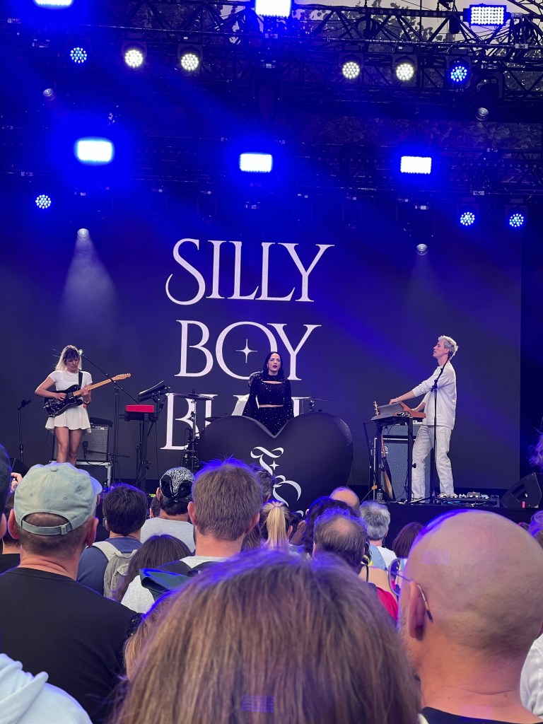De l’autre côté du Bosquet, c’est une fan de David Bowie qui apparaît derrière un gros cœur noir sur scène, en la personne d’Ana Benabdelkarim aka Silly Boy Blue, ravisante dans sa tenue noire perlée de point blanc et qui était ravi d’être de retour à Rock en Seine quatre ans après son premier passage. Ce rendez-vous avec le public de RES, elle en a tellement rêvé qu’elle en a fait des cauchemars, avouera t’elle entre deux chansons, entourée de ses trois musiciens vêtus de blancs. Elle passera en revue les titres de son répertoire qui tourne autour du sentiment amoureux, car elle est comme ça Silly, elle aime donner et recevoir en retour, mais ce n’est pas toujours le cas. Alors elle le met en musique dans un registre émotionnel, pour le partager avec son public toujours à l’écoute de ses complaintes, magnifiées par une voix qui vous fait plier devant votre envie de décamper.