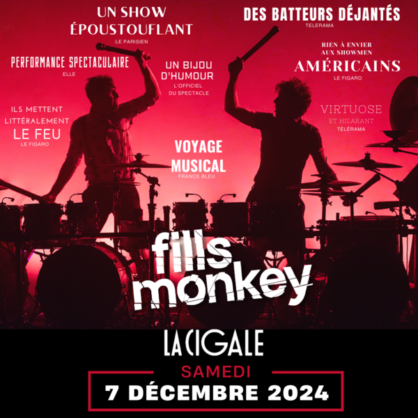 Après la dernière représentation de l’année 2023 le 20 décembre dernier à La Nouvelle Eve à paris avec leur spectacle « We Will Drum You », le duo de batteurs déjantés Fills Monkey, annonce un show exceptionnel à La Cigale le 07 décembre 2024.