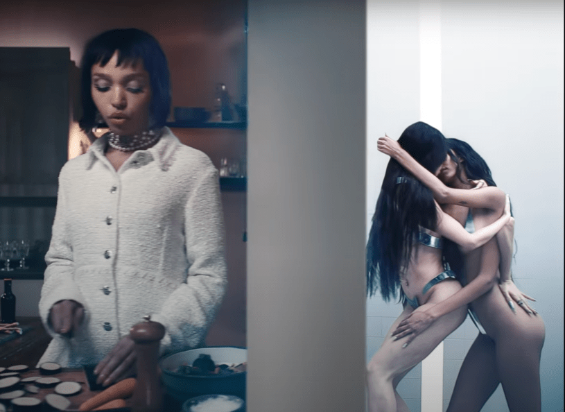 Si, à la première écoute, le rythme propre à l’électro masque et préserve le texte, à la manière dont l’artiste se cache derrière son nom de scène, le visionnage du clip offre quant à lui un regard différent sur la proposition artistique. Mis en scène par Jordan Hemingway, celui-ci révèle une dimension cachée du morceau, accessible uniquement en voyant les images réalisées et pas au travers des paroles. Un autre contraste mis brillamment en avant par FKA Twigs. Dans la vidéo, des silhouettes androgynes sont enlacées, pratiquement nues et proposent des interprétations de scènes du quotidien où l’on découvre ce « parfait étranger » de façon plus intime. Le texte se reflète donc dans le clip : quand FKA Twigs chante son acceptation pour une vie qui comprend une part de mystère, la caméra bascule et passe d’un couple enlacé à FKA Twigs mise en scène comme femme bourgeoise dans la cuisine.