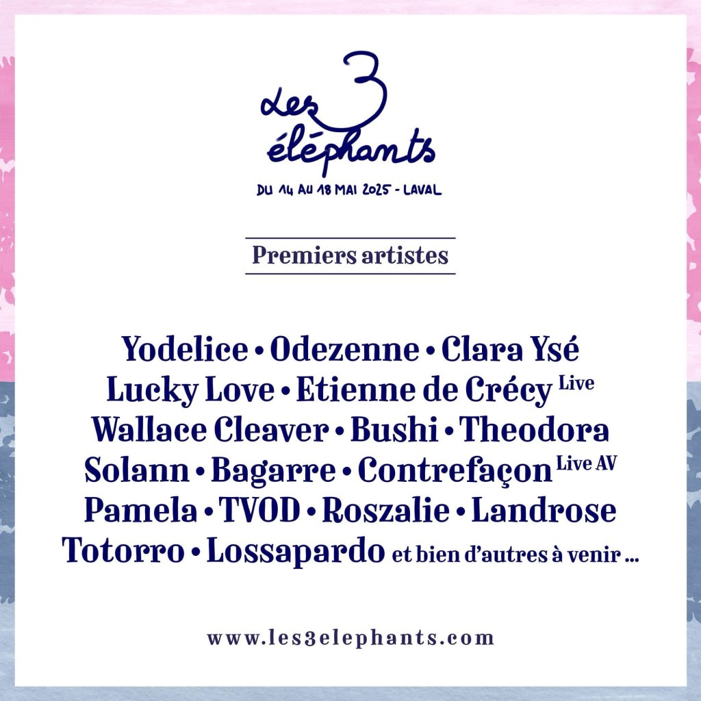 la programmation des 3 éléphants commence à se dévoiler et promet déjà des moments forts pour cette 28ᵉ édition du festival, du 14 au 18 mai prochain à Laval ! Pop, rap, électro, rock… il y en aura pour tous les goûts avec Yodelice, Odzenne, Clara Ysé, Bagarre, Contrefaçon et bien d’autres.