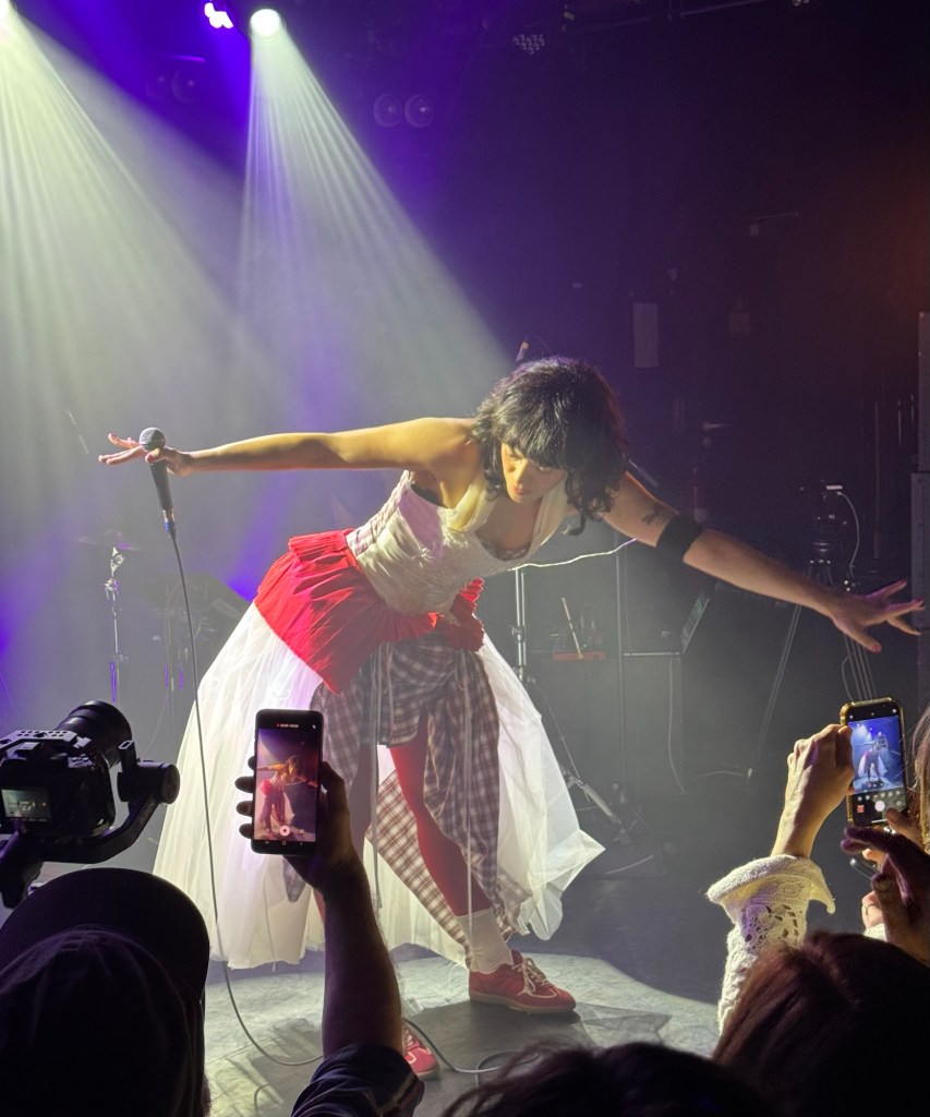 L’émotion monte d’un cran avec « Magnifique », rejointe par Anoraak son premier invité, qui l’accompagne à la basse. Dans la salle, sa mère Catherine applaudit depuis les premiers rangs. Quelques chansons plus loin, c’est au tour du père et du frère de recevoir une dédicace involontaire : « La spirale », chantée pleine face. Elle retire le tulle, reste en bustier noir et jupe, plus guerrière, plus nue dans sa vérité. La cérémonie s’allège, l’intensité monte.