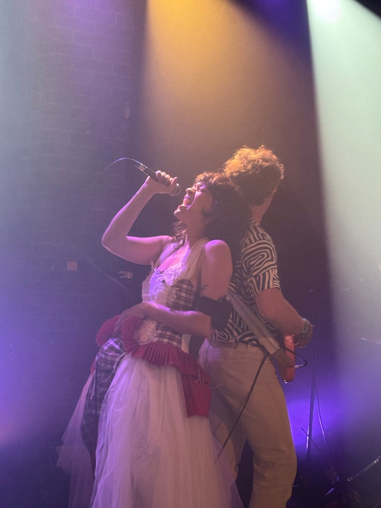 Changement d’ambiance, changement de tenue. Julia revient vêtue d’une robe modulable avec une jupe intégrée et ornée d’un long tulle blanc, comme une mariée qui aurait renoncé au conte de fées. Le contraste est saisissant. « Toujours plaire chanté » ainsi, prend des airs de confession solennelle. Elle nous emmène ensuite « Dans le noir », dans ce refuge intérieur, cette chambre mentale où l’on cherche à prolonger la nuit. Puis viennent les amitiés perdues, « Le désamour », une des rares chansons à évoquer les ruptures amicales, un sujet trop peu chanté.