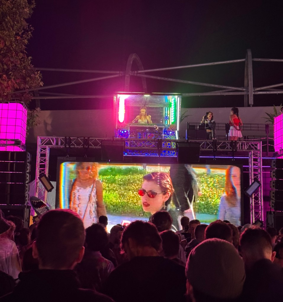 À l’extérieur, la 2Much Stage offrait une atmosphère différente, presque plus intime, sous le ciel nocturne et les lumières colorées. Devant un écran géant diffusant des visuels vibrants, les artistes prenaient place derrière une cabine lumineuse perchée au-dessus du public, créant une proximité unique malgré la foule compacte.