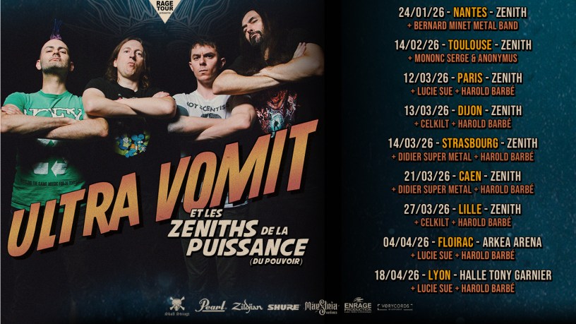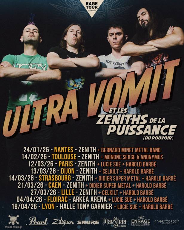 Comme d’habitude, Ultra Vomit a soigné la présentation du texte pour sa communication sur les réseaux sociaux avec des jeux de mots et même des nouveaux mots tels que « frouc », « paringue » ou « euphémitote » tout en manifestant son enthousiasme par l’utilisation redondante des mot « fou » ou « folie » pour décrire la tournée qui débutera le 24 janvier 2026 à Nantes, dans leur ville (lire le post). Il faut reconnaitre qu’il n’est pas particulièrement fréquent de voir un groupe de metal faire une tournée comptant une petite dizaine de Zénith français. Nous remercions Rage Tour d’avoir eu la folie (nous aussi, nous sommes contents) de mettre en place cette tournée de dingue (ou de folie si on veut).