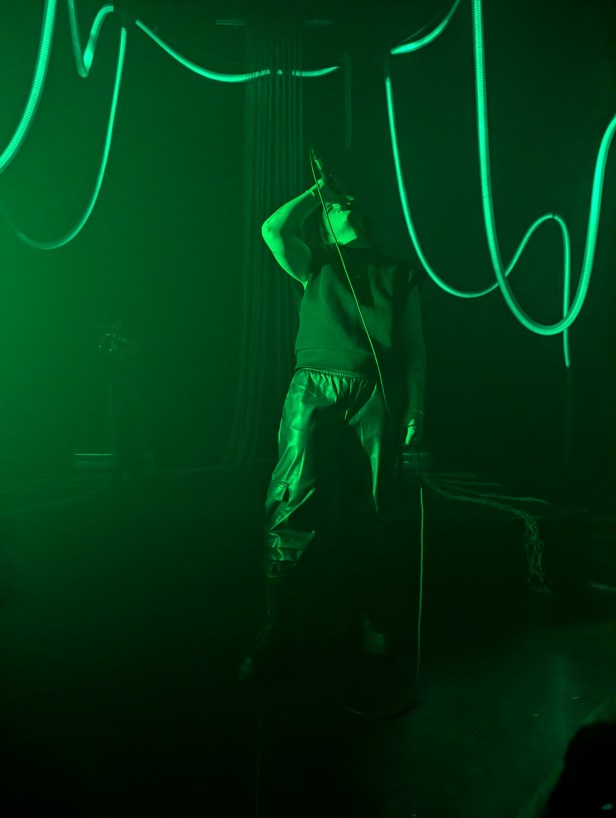 Le set commence comme le récent album, dans une ambiance noire et verte avec In The Name Of Blood suivi de Memory Cells. Dès les premiers instants Sierra Veins nous embarque et plus rien n’existe en dehors des murs de la salle club du 106 à Rouen. Les morceaux s’enchaînent en continuité les uns de autres dans un bel équilibre entre les instrumentaux et ceux durant lesquels l’artiste prend le micro, sur pied ou en main lorsqu’elle nourrit l’intensité en se rapprochant d’un public qui, bien qu’un peu timide, ne forme plus qu’un avec elle.