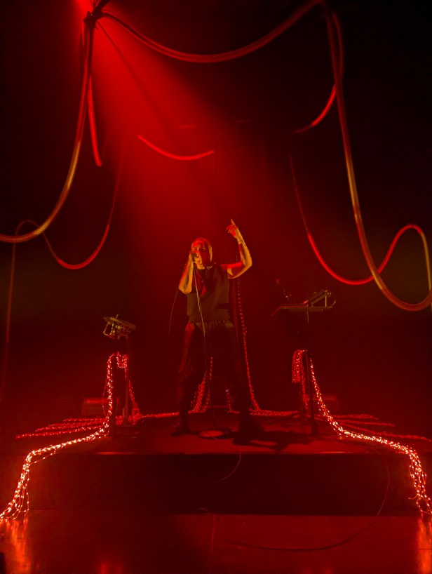 Comme à son habitude (pour nous une quatrième fois ce soir), Sierra Veins se produit seule sur scène, entre ses deux consoles, sur une plateforme dont elle n’hésite pas à descendre lorsqu’elle chante pour se rapprocher de son public. Les nouveaux décors la font apparaître encore plus déterminée mais l’infinie sincérité qui l’habite laisse transpercer une certaine fragilité, reflet de l’intégrité absolue avec laquelle elle nous livre ses émotions. La musique de Sierra Veins transforme les failles en victoires et offre à nos âmes torturées un point d’appui pour glisser vers l’acceptation de nos incohérences. Elle est pure, brute, douce et ténébreuse à la fois. Nous puisons dans les textures et les sonorités de ses morceaux autant de colère que d’apaisement, les deux s’équilibrant dans une transe parfaite.