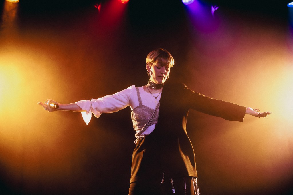 L’attente devient presque palpable lorsque les lumières s’éteignent. Les musiciens prennent place, accompagnés d’une voix pré-enregistrée, avant que Gervaise apparaisse vêtue d’un costume-armure. Une Jeanne d’Arc de la pop qui, en balayant la salle d’un regard déterminé, semble prête à prendre les armes. Pourtant, dès les premières notes de « FAME », ce ne sont pas des ennemis qu’elle affronte, mais les coeurs et les corps du public qu’elle conquiert. Les basses électro font vibrer le Pan Piper et la fosse cède immédiatement au groove.