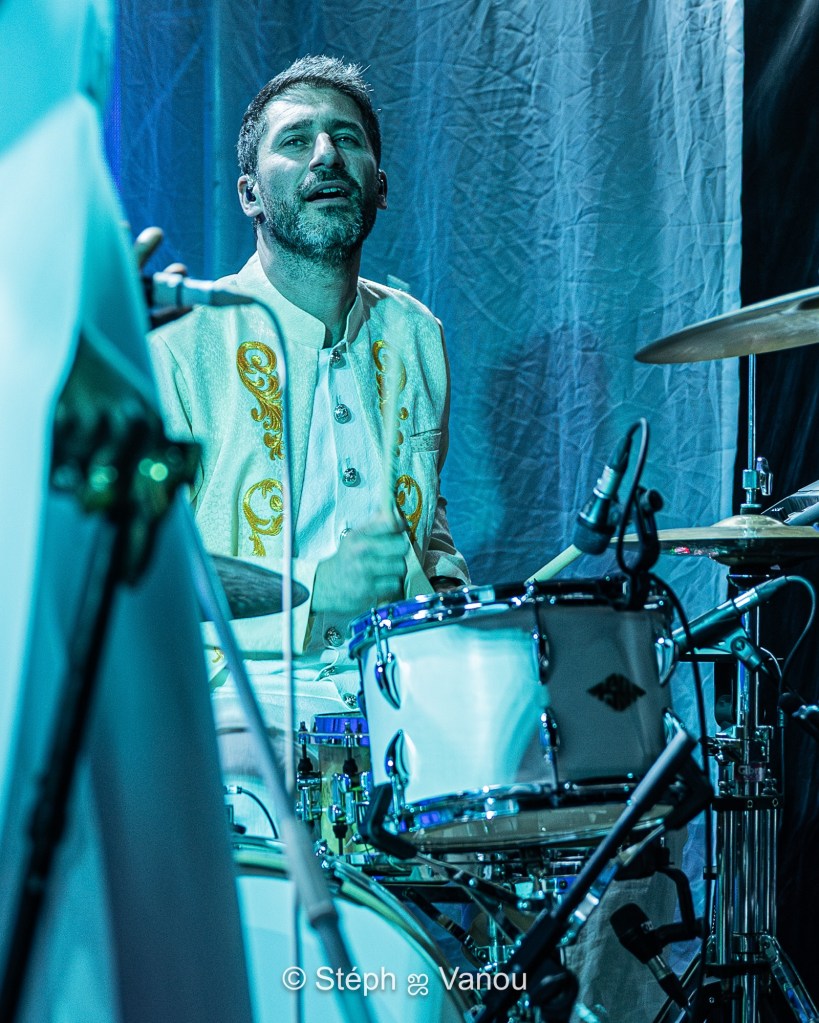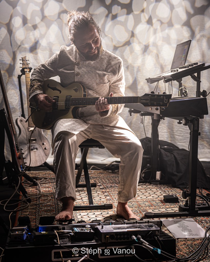 Très vite, Okali entre dans le cœur de son répertoire avec « Traveler » (EP), qui s’élève comme un mouvement naturel, porté par des guitares d’ambiance et des rythmiques souples qui font la signature du duo. Tout semble guidé par l’instinct, par l’écoute, par l’attention portée aux vibrations plus qu’à la démonstration. Puis vient « Sonabile », (hors EP), avant que la scène ne se resserre encore autour de l’intime. Avec « Terra » (EP), Gaëlle prend la parole. «J’aurais pu l’appeler Mama… parce qu’elle me manque beaucoup. J’ai décidé que la terre était féminine, et je l’ai appelée Terra.» La salle se suspend. Sans emphase, l’émotion circule. « Terra » devient un hommage discret : aux mères, à la terre nourricière, aux racines que l’on porte même quand elles sont invisibles. La voix tremble parfois, mais ne cède jamais.