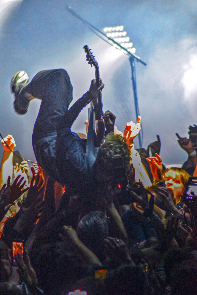 Last Train ne relâche pas la pression. Après la beauté du piano, les guitares reprennent le contrôle. Les refrains se succèdent et le public bascule à nouveau. Le mosh pit se crée, s’élargit, prend en intensité au rythme des riffs. Le public fait partie du concert, chaque titre est repris par la foule. Le groupe livre une performance solide et maîtrisée, à la hauteur des plus grands. L’enchaînement des morceaux semble bien millimétré : impossible de souffler – et personne ne le souhaite. Rien n’est laissé au hasard mais rien ne semble calculé : tout est live, vivant. L’ambiance est brûlante, la communion du public autour du groupe est sans faille. Quand Last Train sort de scène, la foule réclame un encore à grands cris et l’obtient ! Les derniers morceaux sont encore plus savourés, encore plus explosifs. Dans un moment devenu signature, Scherrer, se dresse dans le public, supporté par les fans : l’image est sublime. Puis la foule le porte et le fait voyager au-dessus des têtes. Bientôt, les slams s’enchaînent, c’est tout le public qui se soulève, se fait porter et vit un instant exceptionnel. Le rock français fait ses preuves, rassemble et unit.
