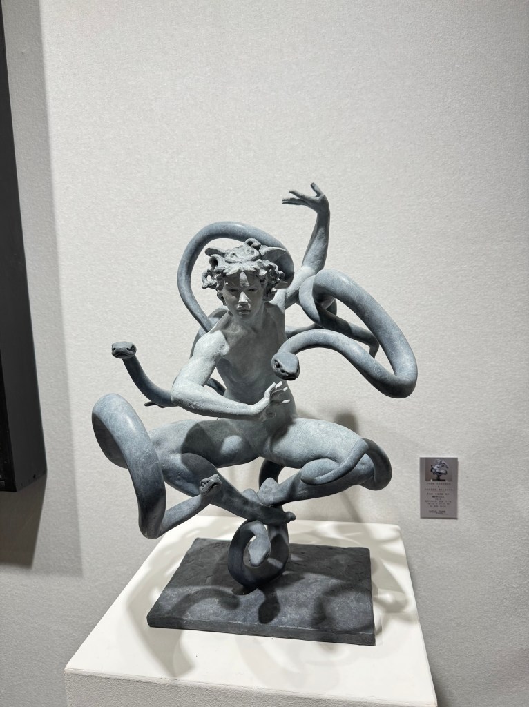 Empreinte de légèreté, la sculpture de Méduse entourée de ses serpents nous happe lors de notre passage. Ses yeux plongent dans les nôtres avec une humanité troublante. Après le regard, c’est la force de la légèreté qui nous frappe. Le bronze devient léger, souple et pourtant solide. Méduse repose avec facilité sur l’un des serpents, les jambes à peine fléchies. Le travail du sculpteur est remarquable : les serpents semblent véritablement onduler autour d’un corps en apesanteur. Méduse, quant à elle, semble figée en plein saut artistique. Le travail du bronze est particulièrement appréciable avec des serpents d’apparence lisse et brillante et la peau texturée du personnage. Dernier détail offert par la foire : la lumière apportée par le dessus projette les ombres des serpents sur Méduse elle-même et son socle, un effet poétique qui apporte encore plus de légèreté et de mouvements.