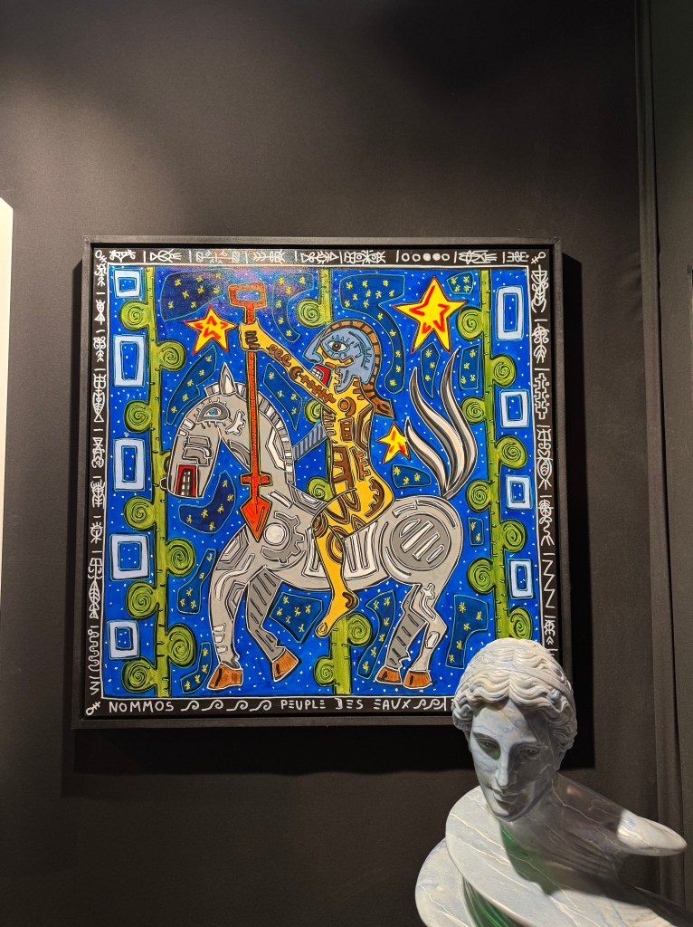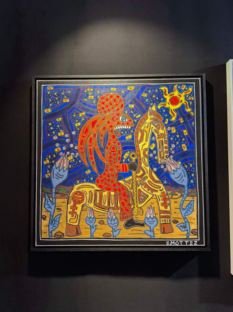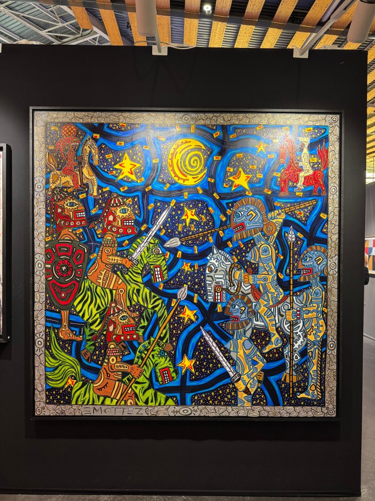 Etienne Mottez, artiste français révélé après le covid-19, propose plusieurs de ses toiles à Art Up. Inspiré par la sculpture d’un Dogon dans son atelier, l’artiste met en scène des personnages colorés dans des univers aux couleurs vives. Les contrastes marqués créent un chaos qui oblige l’oeil à s’habituer à la quantité d’informations pour apprécier l’oeuvre dans tous ses détails. Les peintures, saturées de détails et de couleurs laissent apparaître des peuples qui se combattent sous les étoiles. Des scènes néanmoins empreintes d’une délicatesse inouïe. Le travail de l’artiste se lit jusque dans les détails apportés au cadre et il est difficile de s’arracher à la contemplations des oeuvres tant il y a de détails à observer.