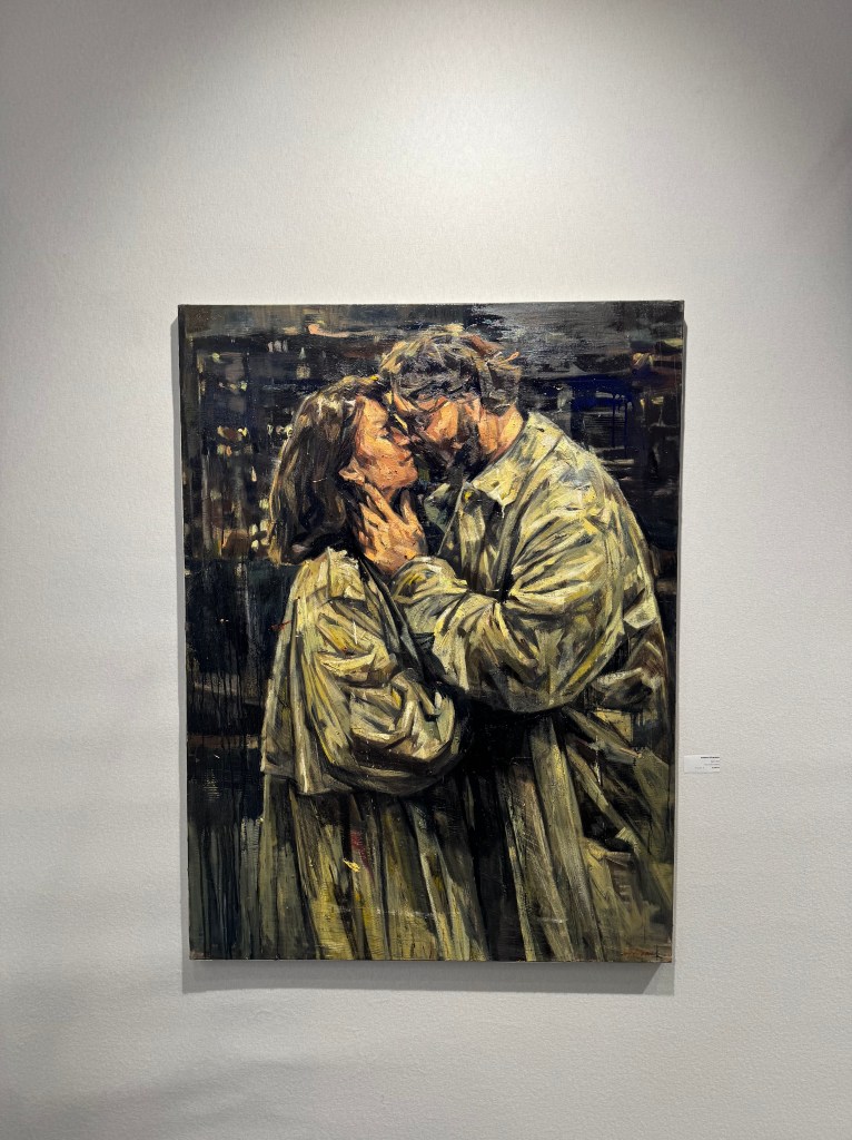 Difficile de rester insensible à la beauté de cette peinture aux dimensions impressionnantes. Le peintre met en scène un couple qui s’enlace avec tellement de poésie qu’au milieu même de l’exposition, on s’arrête et on semble rentrer dans l’oeuvre pour ne plus faire qu’un avec elle. Les émotions sont vives : le couple vient-il de ses retrouver après une course effrénée, mains tendues vers l’autre ? Est-ce une scène d’adieu sous la pluie ? Dans tous les cas, le couple occupe la quasi totalité de la toile, reléguant l’arrière plan à quelques lignes, comme si on était entré dans la bulle des personnages et que le reste du monde n’avait plus d’importance. Avec Night, c’est un instant volé, suspendu dans le temps qui est offert.