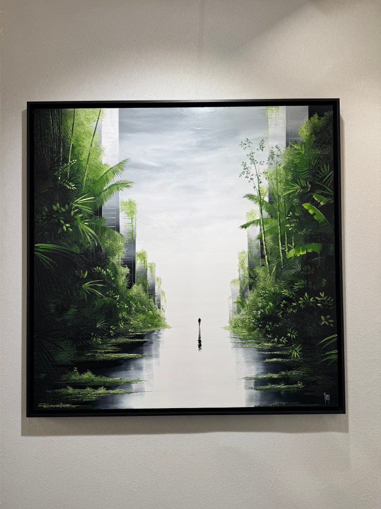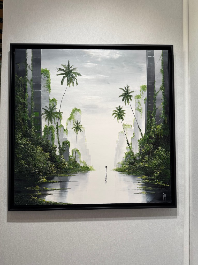 Parmi les nouveautés de cette année, on découvre les nouvelles propositions artistiques de Maurizio Galloro, un peintre que nous avions déjà pu découvrir lors d’éditions précédentes. Ses nouvelles oeuvres placent une silhouette humaine au centre de la peinture mais remettent en réalité l’Homme à sa place. L’humain est présent mais il est minuscule, entouré par les villes qu’il a bâties et la nature qui reprend le pas sur le paysage. Dans des tableaux aux airs post-apocalyptiques, les forêts reprennent leurs droits et envahissent une grande partie du décor. L’homme se retrouve isolé, marchant vers l’horizon, perdu dans l’immensité qui l’envahit. les visiteurs eux, sont invités à se perdre dans un imaginaire grandissant.